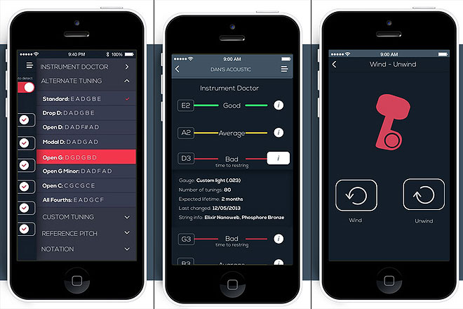▲オープン・チューニングはじめさまざまなチューニングに対応(左)。Good、Average、Badと各弦の状態がひと目でわかる診断機能(中)、弦の張り替えにはWind/Unwind機能(右)を搭載。
