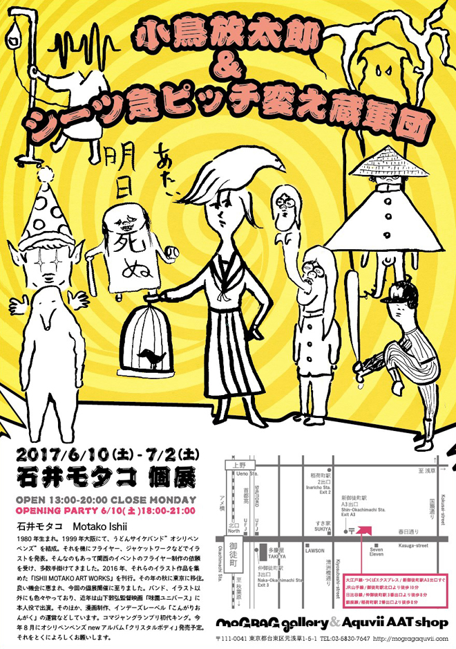 また、石井モタコによる個展『小鳥放太郎 & シーツ急ピッチ変え蔵軍団』がアートスペース/ギャラリー「mograg」にて6月10日(土)より7月2日(日)まで開催されるという。自身のアルバムジャケットワークや漫画などで、音楽同様に独自の作品世界を発表する彼の東京での初個展となり、新作のドローイングとペイント作品をはじめ、過去のアルバムジャケットの原画や複製作品を展示販売。また、会期中は様々な関連企画が会場にて展開される予定とのことだ。