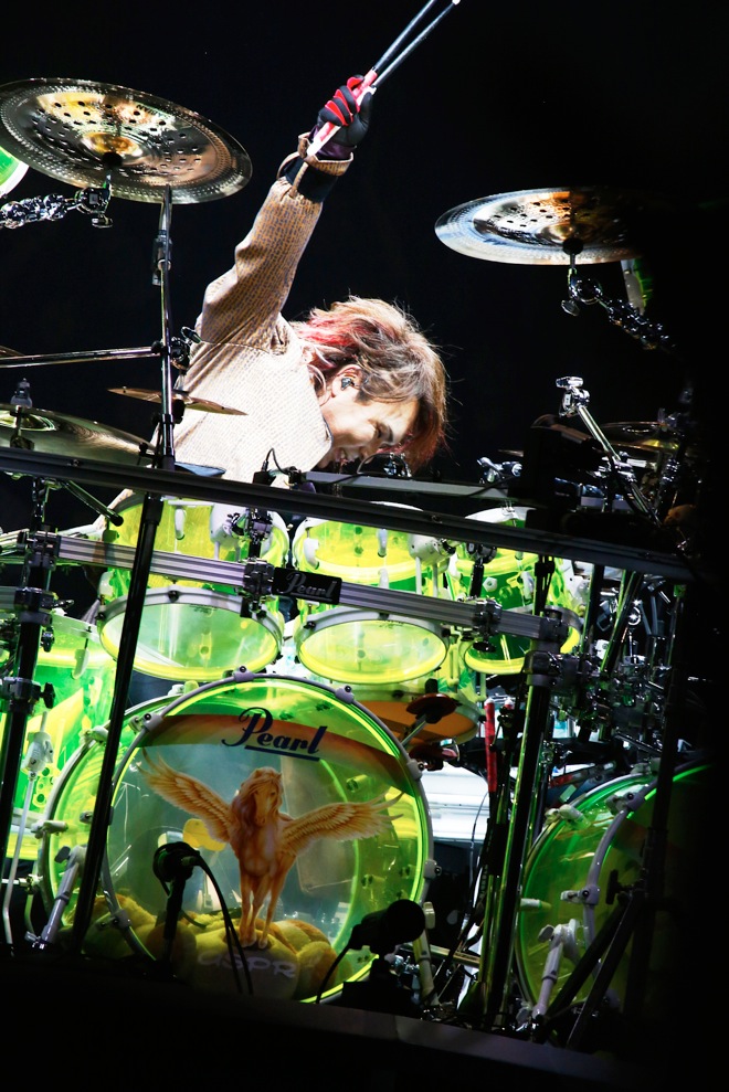 そしてLUNA SEA恒例、「宇宙一の」で始まるメンバー紹介ではRYUICHIに話を振られてINORANが28年前の思い出を話そうとしたことがキッカケで、Jの振りもあって話題はRYUICHIが加入前にライブハウスにドーナツの差し入れを持ってきたエピソードのことへ。「ドーナツを持ってきてくれたんですけど、1個しか入ってませんでした」とINORANが明かすとRYUICHIが「俺、5個入れたはずなんだけど2個って証言もあるし、真ちゃん食べたでしょ(笑)」と笑わせ、SUGIZOが「ドーナツ2個だった記憶があるんですけど」と証言した上で「28年前、神奈川のただの悪ガキたちが、こうやってロックバンドで走り続けてこられるのは感謝以外の何者でもありません」と伝えた。そして真矢はドラムセットから降りてきて、当時のRYUICHIが眉毛がなく、髪が緑だったことを忘れないために今日のドラムセットは緑にしたと話し、みんな爆笑。