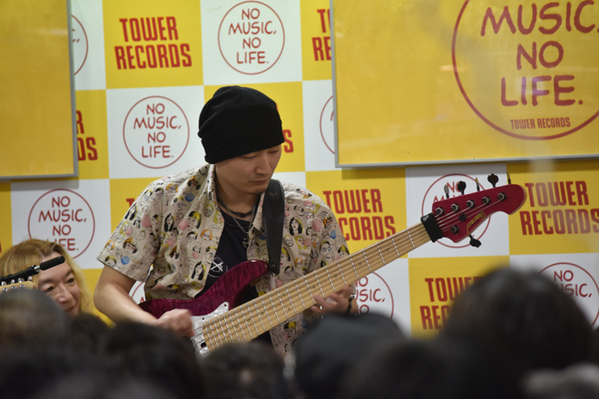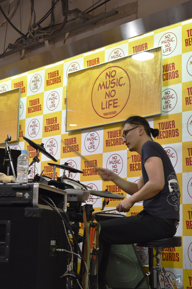 スタジオセッションミュージシャンとして数々のアーティストのバックを務め、国内外で活躍している3人だけにその人気は凄まじく、店内のステージ前には大勢の観覧者が集結。まるでライブ会場にいるのかと錯覚させるような大きな拍手と歓声が、メンバーを迎え入れた。