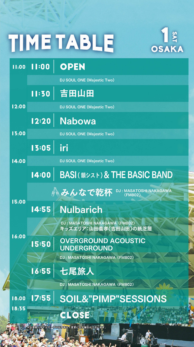 SOIL&“PIMP”SESSIONS / OVERGROUND ACOUSTIC UNDERGROUND / Nulbarich / 七尾旅人 / 吉田山田 / Nabowa / BASI (韻シスト) & THE BASIC BAND / iri