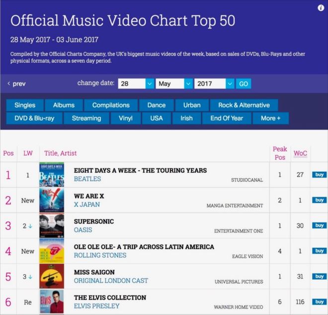 X JAPANのドキュメンタリー映画『WE ARE X』のDVDが、UK ミュージックビデオ週間チャートで2位にランクインしている。