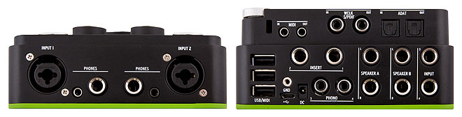 ▲フロントパネルにはXLRと1/4インチTRSのコンボジャックによる入力×2と、ステレオミニ&標準ステレオのヘッドホンジャックをそれぞれ2つ配置。リアパネルにはMIDI入出力(ミニ端子)、ワードクロック/SPDIF、ADAT、USBハブ、インサート、フォノ(RCA)、標準サイズのスピーカー出力2組分、アナログ入力×2を用意。