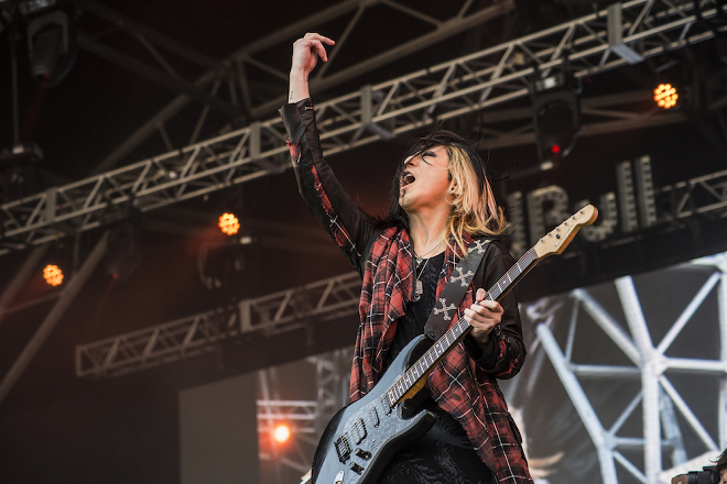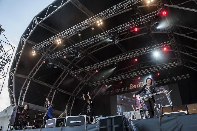 大会は日本人パイロットの室屋義秀が優勝したこともあり、来場した5万5000人も熱気が冷めやらぬ状態。そんな中SEと共にメンバーが登場すると、オープニングナンバーは最新曲「the other end of the globe」からライブがスタート。この日のライブではJIROが世界で一本だけのレッドブル・エアレース仕様オリジナルベースを抱えて登場した。