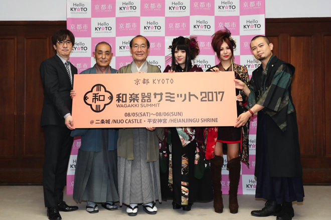 京都市の門川大作市長らとともに行われた<和楽器サミット2017>開催の会見では、当フェスのメインアクトとして平安神宮会場での単独奉納ライブ2daysのステージに立つ和楽器バンドの鈴華ゆう子(Vo)が「幼いころから詩吟、剣詩舞にふれてきて、その中で京都は歴史を深めるために足を運んだりと触れてきました。その京都でライブができるのは特別なこと。全力のパフォーマンスをします!」とコメント。また京都の出身でもある蜷川べに(津軽三味線)も「生まれも育ちも京都です。京都で8人で演奏できることは本当にうれしい」、神永大輔(尺八)は「奉納ライブということで、心を込めて演奏します」と意気込みを語った。