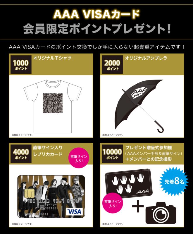 「AAA VISAカード」はポイントを集めるとオリジナルTシャツなど会員限定アイテムがもらえるなどの特典がついたクレジットカード。メンバーとの記念撮影といった貴重な特典も用意されている。グッズ今回このカードが<AAA ARENA TOUR 2017 -WAY OF GLORY->仕様のデザインに変更になる。