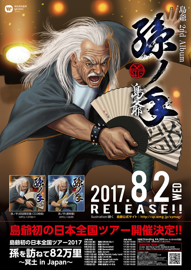 さらに、同アルバムを引っ提げて、9月22日(金)の福岡 DRUM Be-1公演を皮切りに、<孫を訪ねて82万里~冥土 in Japan~」と題した島爺初の全国ツアーの開催も決定。チケットのオフィシャル先行受付が6月17日(土)12:00より6月26日(月)23:00まで実施される。なお、アルバム『孫ノ手』には全国ツアー優先受付シリアルコードが封入される。