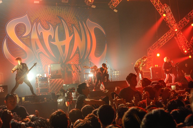 「SATANIC、2年ぶりに帰ってきました、ROTTENGRAFFTYです。2年ぶりにオマエらのこと踏みに行くからさ、しっかり支えてくれよ!」とNOBUYAの言葉から曲は「THIS WORLD」へ。イントロこそ静かでドラマティックだが、曲は急展開、ラウドな音をぶっぱなしていくメンバー達。そして宣言どおりだった、NOBUYAは曲の中盤に客席に飛び込む。ファンに両足をしっかり支えられながら立ち上がる。かと思えばKAZUOMIまで客席にダイブ。「灼熱地獄で終わりまでいこうぜ」と叫ぶのはN∀OKIだった。