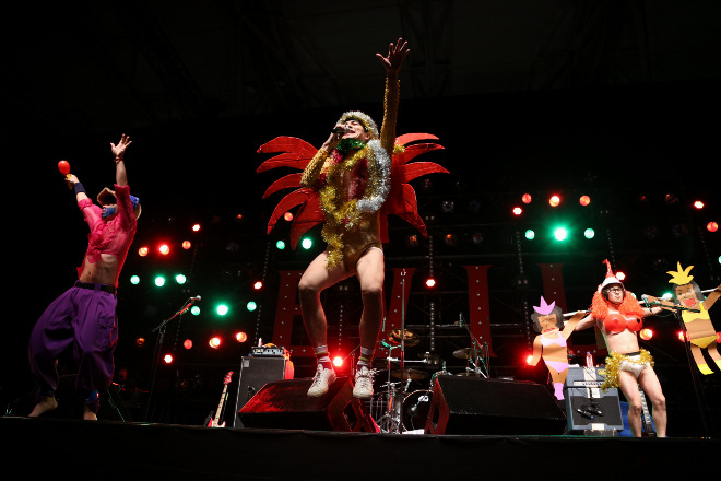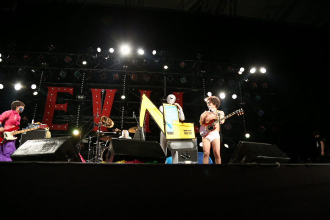 すると、突然謎のアナウンスが始まり、サッカーのBGMでおなじみの「Samba De Janeiro(サンバデジャネイロ)」に乗せてサンバダンサーのコスプレをした四星球の面々が登場。北島が「この音楽に乗せて踊るというのを20分やります!」とネタを飛ばしつつ、「SATANIC CARNIVALにコミックバンドがやってきました!」と高らかに叫ぶと、フロアからは本気とも冗談ともつかないような大歓声が沸き起こる。「今日は4曲やります!」「今日、四星球は新幹線で幕張まで来ました。今日のテーマは“四星球、売れたな!”です」と観客から笑いを取ると、そのまま「Mr.Cosmo」からライブをスタートさせた。