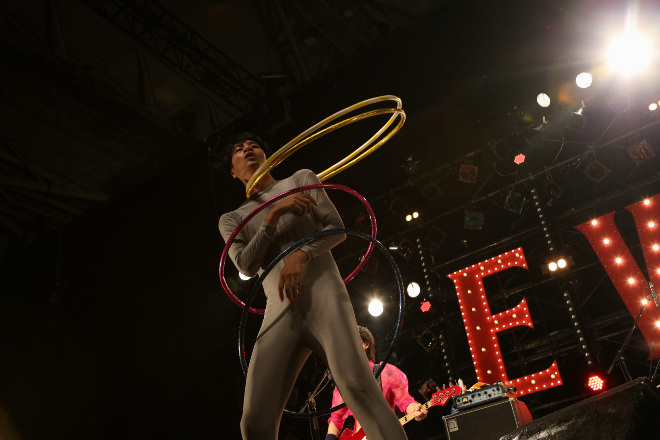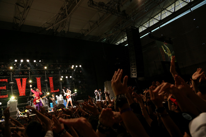 たった4曲かもしれないが、その中身は40曲分あるのではないかと思えるくらい、濃厚なネタの嵐。何枚も履いたブリーフを1枚脱いでは客席に投げ込むまさやん(G)、ベースを弾きながらルームランナーで走るU太(B)、そのバックで強靭なビートを叩き続けるモリス(Dr)と、しっかりした演奏を背に、北島はコミカルながらもどこかキュンとする歌詞を歌い上げていく。その合間には「SATANIC CARNIVALで運動会やりたーい!」と、3曲目「運動会やりたい」の合間に“ウォール・オブ・デス”ならぬ“ウォール・オブ・デスを仕切る人”合戦や“サークルモッシュ”ならぬ“大学のサークル勧誘”をオーディエンスに命じていく。これを繰り返すうちに、フロアの沸点は着実に高まっていき、ラストナンバー「妖怪泣き笑い」でのビーチボールを使った“座ってからのジャンプ”でクライマックスを迎えた。