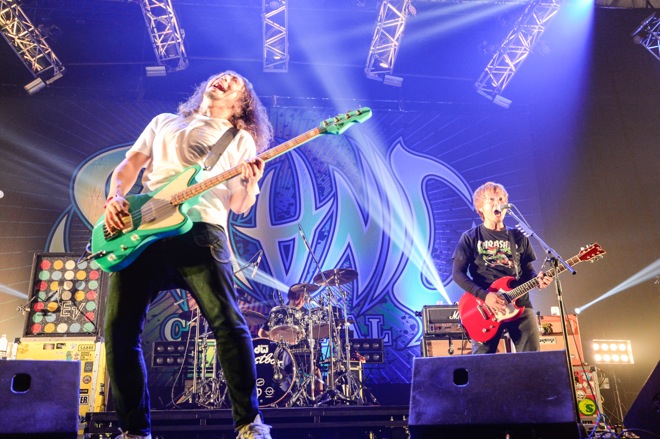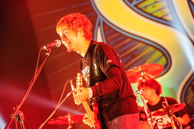 「Wall Of Ice」や「Jupiter」といったライブ定番の曲では、抜群のタイミングで観客のコールやシンガロングが起こり、一体感を増す。心を晴れにして、かたっぱしからフロアに笑顔を咲かせていく、実にdustboxらしい空間だ。しかしJOJIは「俺たちだって、ワルい曲、サタン的な曲だってあるんだよ!」とのたまい、SUGAのメタリックなギターに合わせてメロイックサインを決めると、アルバム『Thousand Miracles』のなかでもメタリックで、遊び心がふんだんな「No More Tequila」をお見舞いする。