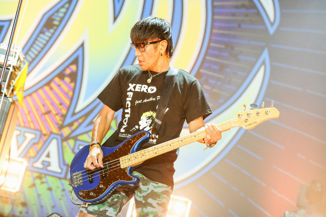 今年の<SATANIC CARNIVAL>初日もいよいよ後半戦へ。SATAN STAGEではKen YokoyamaことKen Bandが、折り返し最初のステージを展開した。特にSEもなくステージに姿を表した4人はそのまま所定の位置につくと、黙々と準備を始める。GRETSCHのシグネチャーモデルを手にした横山健(Vo&G)は、観客からの「健さーん!」の声に笑顔を見せつつ「楽しんでますか、<SATANIC CARNIVAL>! 4年連続、4回目の出演となりますKen Yokoyamaです。いい雰囲気だね!」と挨拶。そこから「Punk Rock Dream」で勢い良くライブをスタートさせた。バンドのエネルギッシュな演奏に、オーディエンスは序盤から大合唱で応えたり、クラウドサーフを連発でしたりと、全身を使ってリアクションする。