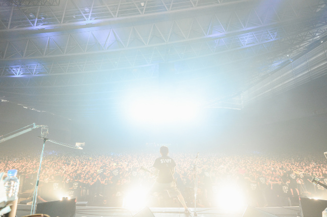 ライブ後半戦は、最新の代表曲「I Won’t Turn Off My Radio」から開始。冒頭のフレーズでは横山の歌とギターをかき消さんばかりに、オーディエンスの歌声が幕張メッセ中に響き渡る。それはバンドの演奏が加わってからも同様で、いかにこの楽曲が若い世代からも愛されているかが伺えた瞬間だった。さらに「Ten Years From Now」「Ricky Punks III」といったライブの人気曲が連発され、初期の名曲「Believer」ではこの日一番の大合唱が発生。横山は満面の笑みでマイクをフロアに放り投げ、時に演奏に徹し、時にオーディエンスと一緒に歌う。間違いなく、この会場にいる者がひとつになった瞬間だった。