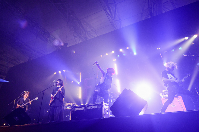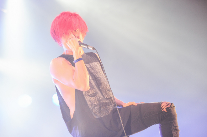 「O.B.M.A」も、続く「ll:α→Ω:ll(アルファオメガ)」もそうだが、a crowd of rebellionの楽曲はとにかく緩急が激しい……いや、ただ激しいというよりも、複数のジャンルが1曲に中に詰まっていると呼んだほうが正しいかもしれない。ラウドロックをベースにしつつも、J-POPやJ-ROCK、チップチューンなどを含むエレクトロなどさまざまな要素を含むフレーズが、ジェットコースターのごとく次々と押し寄せてくるのだ。ヘヴィでダウナーなブレイクダウンの次にはダンサブルなリズムが飛び込んでくるし、宮田のスクリームやグロウルに続いて小林亮輔(Vo&G)のハイトーンボイスが鳴り響き、さらに丸山漠(G)のメロウでメタリックなギターソロまで登場する。高井佑典(B)&近藤岳(Dr)のリズム隊はこの複雑怪奇なアレンジのボトムを支えているのだから、本当にすごいバンドだと言わざるをえない。