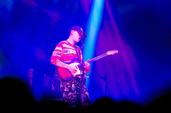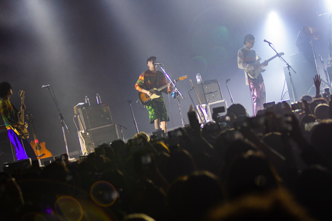 この曲にとどまらず、既に彼らはいくつもの代表曲を持っているという事実にはあらためて感服する。「Wanli」に続いて演奏された「MASITNONSOUL」がいかにもそうで、歌のサビ等は特になくとも、曲がひたすら前進していき全ての瞬間がハイライトのようなこのロック・ナンバーは、ライブで聴きたい曲のひとつ。アクション映画のワンシーンのように鋭い赤い光線が幾本も格子状に天地左右を貫くという照明も、その興奮に拍車をかけていた。また、本編ラストの前に、「このアルバムは、誠実な愛と幸せを探す方法です。幸せは、愛を通じてだけ得られるようです。なので、僕たちはみんなが大好きだし、愛してます」というメッセージを述べて演奏された「LOVE YA!」では、スイートで広義的なこのラブソングとリンクするように、ポップでカラフルな光線が視界を埋め尽くし、祝祭空間を育んだ。
