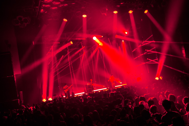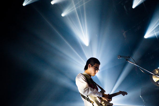 STUDIO COASTがまるでひとつのアート作品のようだったのは、韓国公演と同じシステムを導入した照明にもよると思う。ライブ序盤では、「何色かが広がっている」というくらいのかすかな色味が神秘的かつアーバンな雰囲気をもたらした。一方で中盤の「Comes And Goes」ではバイオレットとエメラルド色のライトがヴィヴィッドに交錯し、ダンサブルに刻まれるカッティング・ギターと相まって一気に動的な空間を生んだ。次曲の「Wanli」では、ディープなその音像を可視化するかのように目のさめるような真紅がステージを染め上げた。この曲は彼らの代表曲のひとつでもあると共に、演奏をはじめる瞬間にそれまで目深にかぶっていた黒いキャップをオ・ヒョクが取ったことも加味されたようで、イントロから会場がドッと沸いた。
