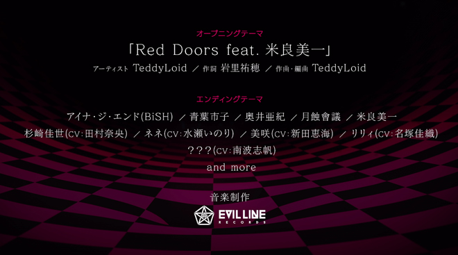 また、このPV上で各話毎にエンディング主題歌を担当するアーティストとキャラクターも発表。アーティストとしてはアイナ・ジ・エンド(BiSH)、青葉市子、奥井亜紀、月蝕會議、米良美一らが歌唱。キャラクターでは杉崎佳世(CV:田村奈央)、ネネ(CV:水瀬いのり)、美咲(CV:新田恵海)、リリィ(CV:名塚佳織)、???(CV:南波志帆)らが歌唱を担当する。