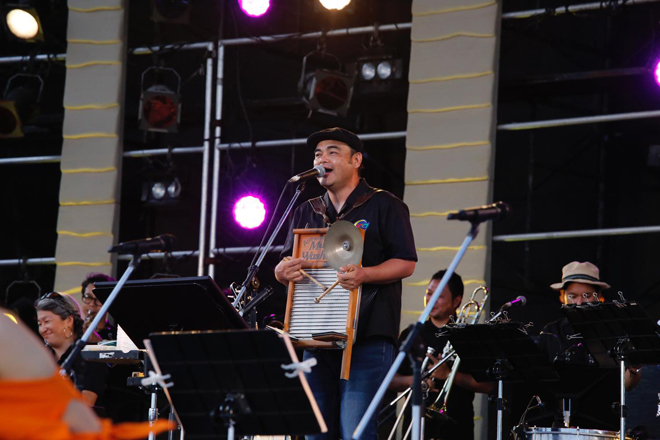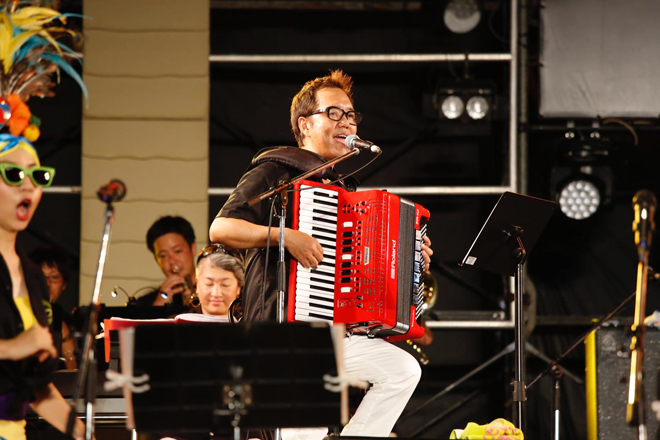 昭和コーナーが終わると、ステージ上には嘉手納町文化協会民謡部のメンバーが登場。これまた今回初チャレンジという「沖縄民謡と、マルシャショーラのコラボ」が始まった。歌われたのは、いずれも嘉手納町にゆかりのある民謡「比謝川小唄」「月眺み」「芋ぬ時代」の3曲。曲間では、ゆったりした三線のリズムにバンドが一瞬戸惑うようすも見られたが、すぐにテンポを把握してリズムを刻み始め、セッションは続いていく。どんなジャンルの音楽とも見事にコラボできてしまう、マルシャショーラの底力を感じた瞬間だった。