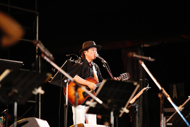 BEGINのステージの後は、嘉手納町連合青年会と千原郷友会によるエイサー演舞を挟み、藤原さくらが登場。昨年2016年は音楽活動だけでなくドラマにも出演して注目を集めた彼女は、実は今日が沖縄初上陸ライブとのこと。アコースティックギターの弾き語りで、ドラマ主題歌の「Soup」をはじめ、「500マイル」「春の歌」など全5曲を熱唱した。いつのまにか太陽が傾き赤く染まり始めた会場の空に、彼女のスモーキーでキュートな歌声が、伸びやかに心地よく広がっていった。