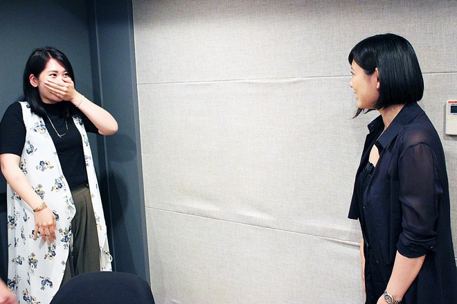 レコーディング開始前には、吉岡ディレクターからマイク乗りの良い歌い方をアドバイスしてもらい、ブースに入ってマイクなど機材の説明、音の調整の仕方をレクチャーされてから、いざレコーディング本番へ。もちろん歌う曲は「beautiful」。左手を広げながらテンポや音程を取りながら歌う小山田さん。さすがの歌唱力だ。歌声も絢香本人の声をよく研究しているようで、ときおり出るトーンにそのファンぶりが見て取れた。