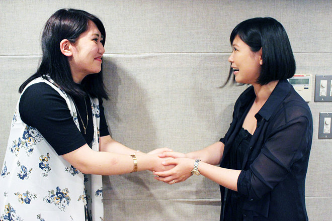 ここで、2人で並んでこれまで録音した音を聴くことに。絢香の隣で自分の歌を聴くとあってさすがに緊張を隠せない。足でリズムを取って聴きながら「なんか不思議な感覚だね、自分の声じゃないって(笑)」と笑う絢香。「とくに、サビとかの声を張ったところが持ち味だと思いました」と歌声についての感想を伝えると、小山田さんは嬉しそう。「せっかくの機会なのでもし聞きたいことがあれば」と声をかける絢香に、「歌手を目指していた頃に、やめたくなったことってありますか?」と質問する小山田さん。「そうねえ、本当に歌手になれるかなあ、とかもちろん不安になることもあったけど、“自分は絶対歌手になるんだ”って決め込んでいたから。それが強いパワーになっていたかな」と自身の経験をもとにアドバイスを送っていた。「またライヴに行きます」と小山田さん。9月から始まるアコースティック・ライヴ・ツアーに、青森の家族と一緒に行くことを決めているそうだ。まだレコーディングの途中ということで、固い握手を交わして「楽しんでね、頑張って!」と絢香から激励され感激の面持ちの小山田さん。