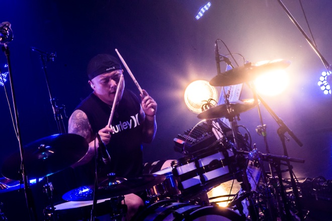 暗く落とされた照明の中、届けられたのは夜のしじまの中、祈りを捧げるようなナンバー「When You Sleep」だった。その音世界に浸るフロアをさらに引き込むように鳴らされたのは内に秘めた熱がボディブローのようにじわじわと効いてくる「ACROSS THE NIGHT」だ。“壊れたのなら また最初から 創り始めればいいさ”というフレーズが突き刺さってくる。