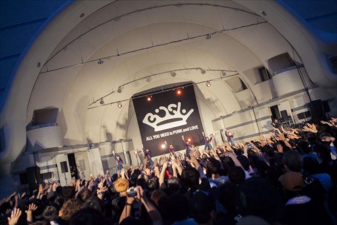 その後19時からフリーライブはスタート。3000人を越えるオーディエンスが詰め寄せる中、新作のリードトラック「GiANT KiLLERS」からライブをスタートするといきなり盛り上がりは最高潮に。サークルモッシュも多数発生し、熱いコール&レスポンスが飛び交う。続いて「Marrionette」「Nothing.」「社会のルール」「VOMiT SONG」とミニアルバムの曲順通りに新曲を連続で披露。