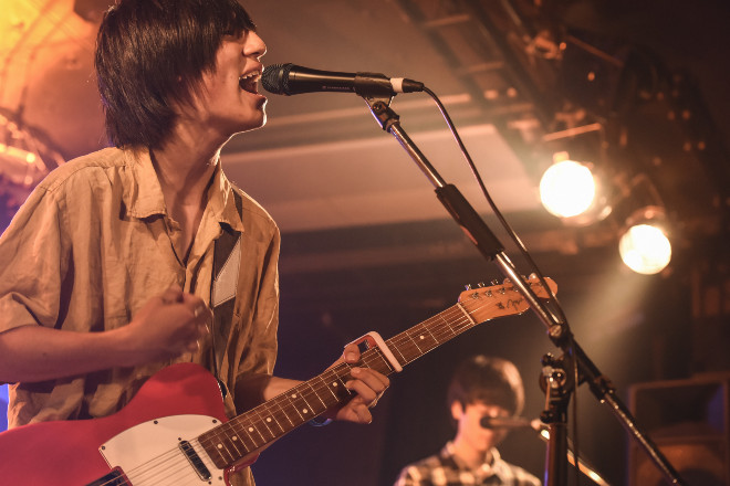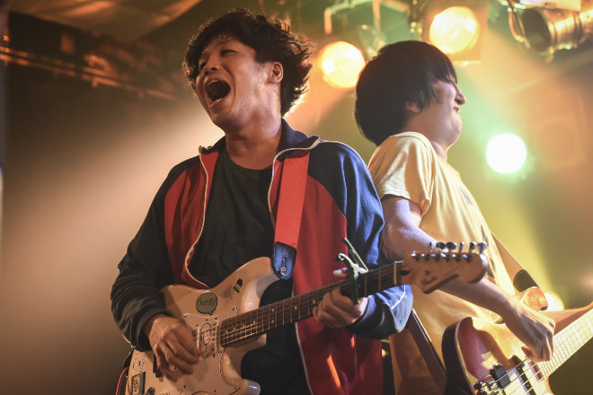 三番手に登場したのはEgoGram。「楽しくいこう」(山本廉/Vo&G)と手短な挨拶を済ませると、山本のクセのある声とそのヴォーカルと火花を散らすようにグイグイと前に出てくる坂田直謄(G)の硬質なギターの音色で、フロアに向かって自身らの存在感を提示していく。「バンドは見ようと思えばYouTubeでも見れるし、その再生回数やTwitterのフォロワー数とかなんでも数字で見れてしまうような、そういう信用できないようなこの時代の中で、今日こうやってみんなが足を運んで見に来てくれてることには何よりも価値があると思う。そんなネットで見れる数字よりも、僕は岡山からこの東京に向かうまでの10時間のほうが信用できるし、ツアーで回った走行時間のほうが信用できるし、ここに来てくれたみんなのことが信用できます。絶対また会いましょう、最後にそんな曲を」という言葉と共に歌われた「グッドバイ」は、4人の抑えきれない情動が見事に乗っかった瞬間で、坂田と垣内渉(B)のコーラスが重なる瞬間のバンドとしての一体感が強烈だ。そんな重く熱いアンサンブルを最後に叩きつけていくパフォーマンスでステージを後にした。