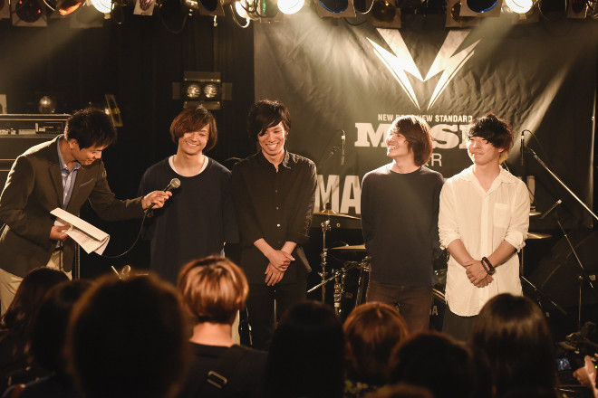 だが、きっちり他のバンドにはないエネルギーを見せつけていたのが、Rollo and Leapsの終演と同時に始まったオーディエンスと審査員達による投票とその集計を待つ間にゲスト・アーティストとして登場した、本大会の2015年の優勝バンド・パノラマパナタウンである。多くの舞台やプロとしての楽曲制作を体験してきたその経験値を血肉化してきた重厚感のあるアンサンブルが快調で、ねっとりしたグルーヴを聴かせる「シェルター」も、彼らの代名詞とも言えるヒップホップを吸収したロックナンバー「ロールプレイング」も、緩急をつけながら爆発していくパフォーマンスを披露。自身らの曲がライヴの中で育っていっていることが如実に表れるプレイであり、何より「ただの30分じゃない。ただのオーディションのライヴじゃない。今日を伝説の夜にしにきました」という岩渕想太(Vo&G)の宣誓にも表れている通り、彼らのスタンスは常にチャレンジャー。「未来のことを考えると正直泣き言を言う時もある。でも、俺達は光しか見てないし、自分達のやりたいことを貫けばシーンを変えられると思ってます。だからみんなもやりたいこと貫いて欲しいと思います」(岩渕)という告白も飛び出したが、ある意味、この日一番「等身大」の姿で臨んでいたのが彼らだろう。苦難を知ったからこそ、真ん中にある理想や信念だけが歌になるようになってきたのだろうか。そんなゲストアクトとしてではなく「7組目のアクト」として登場してきたような熱演は「リバティーリバティー」で終幕し、会場に熱気を残し「結果発表」へとバトンを渡していった。