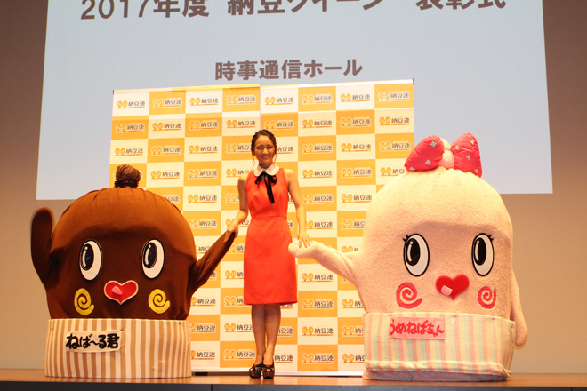 「納豆クイーン」とは全国納豆共同組合連合会(納豆連)が“7月10日は『納豆の日』”をPRすべく、納豆食推進のイメージリーダーに贈呈する称号。これまでに菊川怜、上戸彩、和田アキ子らが受賞し、今年2017年の「納豆クイーン」には納豆好きを公言しているタレントの岡田結実が選ばれた。授賞式では岡田結実が、父・岡田圭右(ますだおかだ)はじめ家族全員が普段から納豆を食べているというエピソードを紹介。茨城県名産の納豆をモチーフにしたマスコットキャラクター、ねば〜る君とうねめばちゃんも応援に駆けつけ、あわせて「8代目ミス納豆」には三田寺理沙と日野麻衣からなるユニット「しーくいーん」が選ばれたことも発表された。