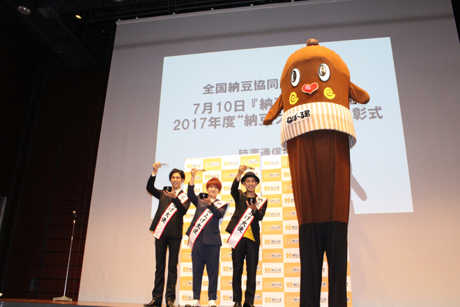 また、「avex納豆部」の花村想太、井澤勇貴、武子直輝の3名もこの表彰式に登場。司会者に呼び込まれた彼らは Da-iCEの「トニカクHEY」が流れる中、ステージに登壇する。2016年に設立されて以来、納豆をテーマにした動画企画などを行ってきた「納豆部」はSNS部員が1万5000人を突破するなど、納豆のPRに大きな影響力を与えてきたという功績が評価され、今回納豆連から「納豆盛上げ大使」に任命された。
