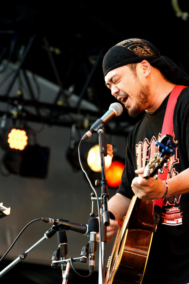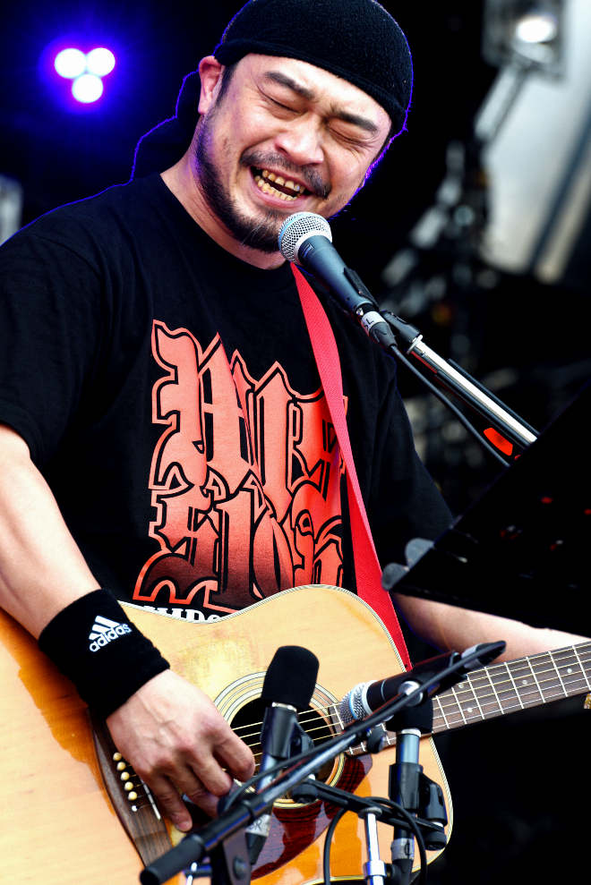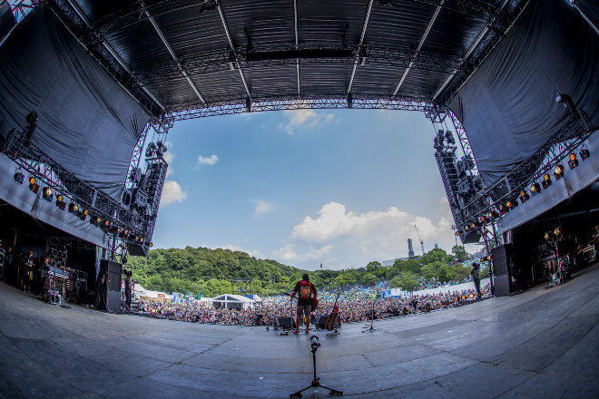 「今日も黄色い声援がゼロの、5曲目です……もう諦めたんだそれは」なんて自虐気味に言って、笑いと歓声を巻き起こしながら、後半はその歌のエピソードを聞かせ、語りかけるような距離で歌を伝える。学生時代を過ごし、歌をはじめた北海道での、数々の恩人を思い浮かべながら書いたという「ママさんそう言った ~Hokkaido days~」、CM曲としてもお馴染みとなった「よー、そこの若いの」では、「一か八かの賭けで、サビの前にカウントを入れてみたら、まんまと歌ってくれましたね」とお茶目に笑い、「ちぇっく!」では息継ぎなしでまくし立てる切迫した歌が、サウンドのスピードを加速させる。野外の会場が、ライブハウスに凝縮されたような空気の濃さに痺れ、観客が一体化していく。