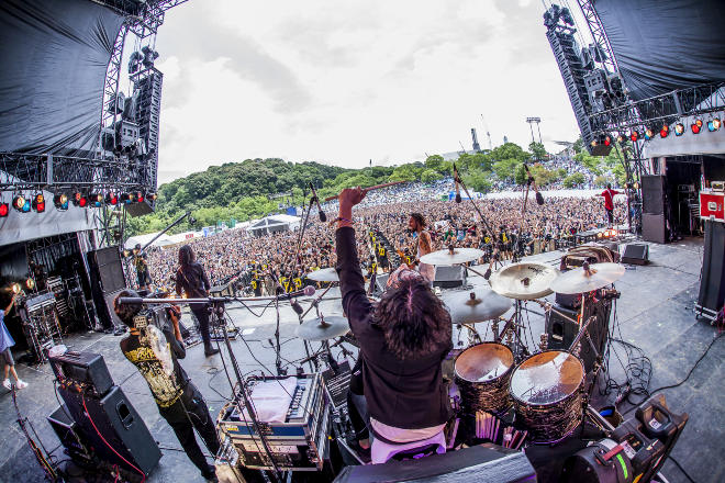「Friends」では、BOOM BOOM SATELLITESらのことに触れ、俺の中ではフォーエバーだとMC。「俺らがやるこの1コマ。どうできるかわからないけど、俺らなりに埋めさせてもらいます」(JESSE)と、重厚なアンサンブルを響かせた。熱いメロディに観客が大きく手を振って、声を上げて、一体化していく。ライブハウスでの酸欠必至のライブも最高だが、こうした大きなステージが似合うバンドだし、似合うバンドになったと思う。続く「Thread & Needle」では、そのことを痛感する。「俺らにとってすごく大事な曲」と語ったこの曲では、観客から自然にシンガロングが起こり、その何千、何万の声をコーラスに歌を歌い上げるドラマティックな曲となった。一緒に音楽を奏でている感覚だ。