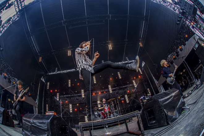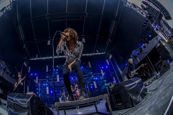 ヴォーカル、渋谷龍太の宣言でスタートした、<京都大作戦>3日目。源氏ノ舞台のトップバッターを担うのは、フロム・トーキョージャパン、SUPER BEAVERの4人だ。「バチが当たるといけませんので、3日間のハイライトをやらせていただきたいと思います。丘を越えてやってきました、SUPER BEAVERです。おはようございます、京都! お待たせしました、京都!」と渋谷はのっけから声をはり上げ続ける。言葉こそ丁寧だが、そこにはライブへの熱い闘志が満ちていて、色っぽいほどの気迫がある。一番手として、最高のエネルギーを持ったバンドだ。