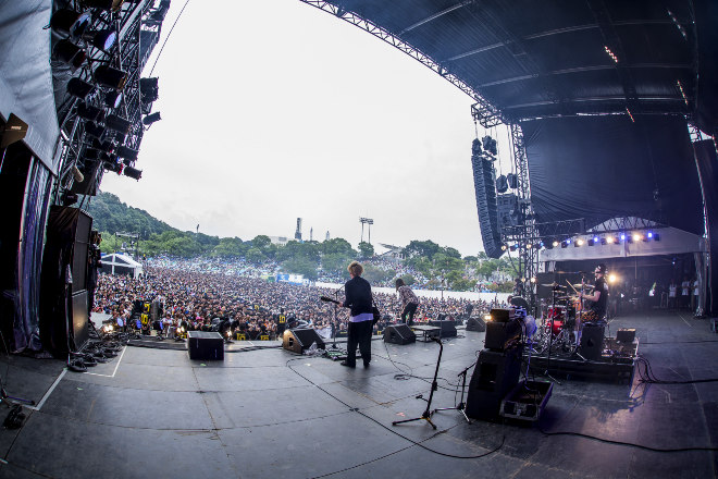 “何かをしっかり証明したい”という言葉から、「証明」でスタートしたライブは、高いテンションで、かつ感情ダダ漏れのアンサンブルで心を掴んでいく。スティックを高く掲げて観客を煽りパワフルにドラミングする藤原広明、柳沢亮太(G)と上杉研太(B)は、シンガロングや手拍子を煽りながら、迫力あるプレイで魅せてくれる。歌をど真ん中にした、王道のロックが太陽が丘に響きわたると、会場の手拍子や歌声も大きくなる。開始直前に小雨が降っていたが、続く「美しい日」をアカペラで歌いだす頃には、ほとんど止んでいた。会場をぐるっと見渡して、「10-FEETにも届きますように、よろしく」(渋谷)と観客を煽る。楽器の3人で向かい合い、エネルギーを掛け合わせるように放つ音は、渋谷のヴォーカルを力強く後押しする。「青い春」の熱い言葉が、遠くまでまっすぐにとんでいくのが、目に見えるようだ。