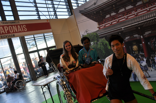 また、ステージ以外の時間では来場者を人力車に乗せて会場を周回するというサービスもおこない、これには本物の人力車を初めて見る外国人も大喜び。乗車希望の人で溢れ、列が長蛇となった。東京力車はこのサービスのために日本から人力車をフランスまで運んだという。