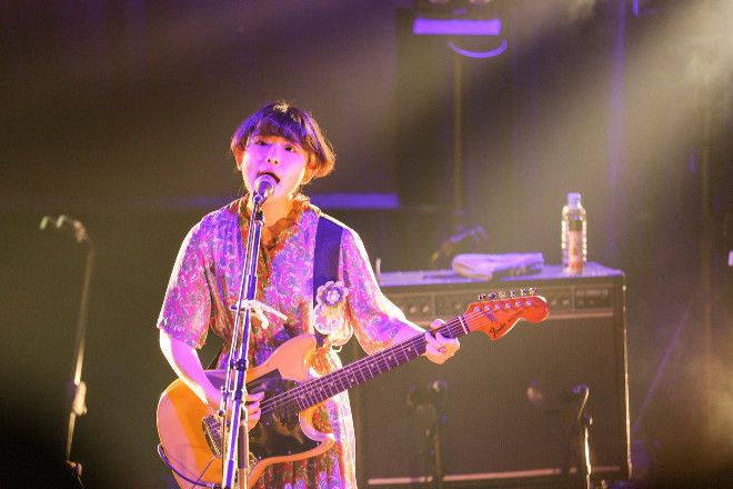 3人組ガールズバンド、リーガルリリーは柔らかくてほんわかとした歌声でありながら、ヒリヒリとした焦燥を掻き立てる鋭いロックサウンドで会場の空気を一変させた。ステージには下手からドラムのゆきやま(Dr)、中央にベースの白石はるか(B)、上手にたかはしほのか(Vo&G)が立つ変則的なフォーメーション。ミディアムテンポの「トランジスタラジオ」を皮切りに、仄暗い夜を散歩するような「ぶらんこ」、静と動を行き来しながらロックンロールの価値を問いかける「リッケンバッカー」を披露して、フロアに集まったお客さんの感情を激しく揺さぶっていた。そのステージの終盤では7月5日にリリースされたばかりの『the Radio』に収録されている「高速道路」や「はしるこども」を披露。その歪で美しい音像はこの日唯一のガールズバンドにして鮮烈な印象を残すステージだった。