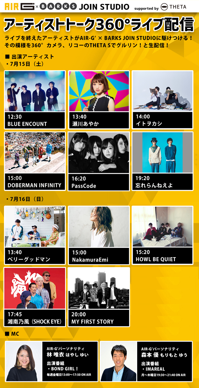 昨年同様、人気のアーティストトークには、湘南乃風(SHOCK EYE)とPassCodeの出演が追加決定、タイムテーブルが下記に決定した。15日(土)に登場するBLUE ENCOUNT、瀬川あやか、イトオカシ、DOBERMAN INFINITY、忘れらんねえよ、16日(日)に登場するベリーグッドマン、NakamuraEmi、HOWL BE QUIET、MY FIRST STORYなどお気に入りのアーティストの出演時間を事前に確認していただきたい。なお、こちらのトークイベントは、360°カメラ、リコー THETAでライブ配信されるので、<JOIN ALIVE>に行けない!という方も現地の雰囲気を感じつつ、アーティストトークを360°映像で体験してみよう(※ライブ配信は、BARKS内「JOIN ALIVE 2017」特設ページにてご覧いただけます)。