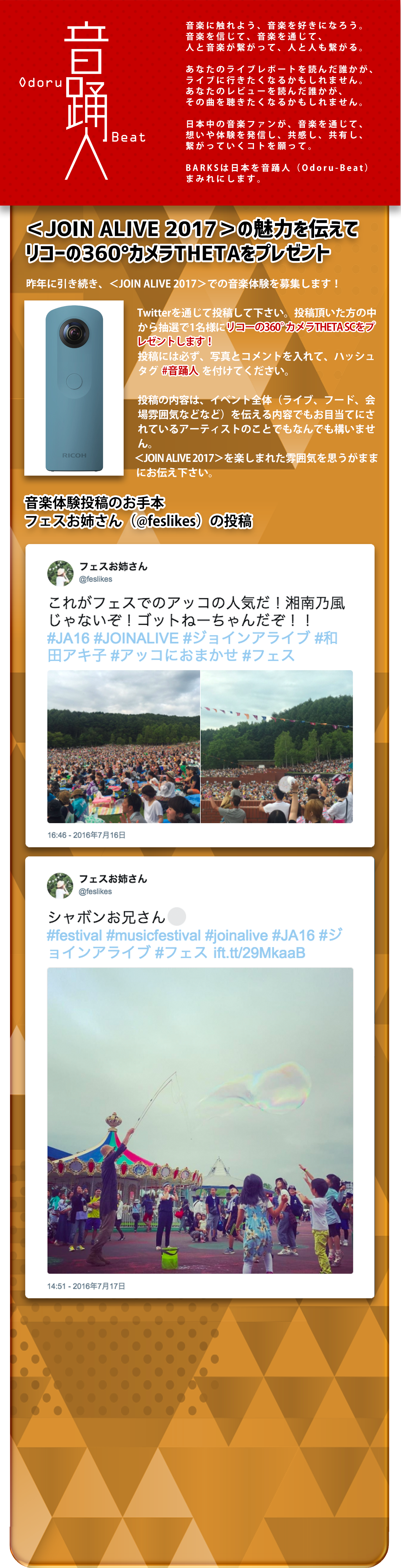 さらに「音踊人」では、<JOIN ALIVE 2017>のい魅力を伝えて、リコーの360°カメラTHETAプレゼント企画を実施。詳しくは下記を参照していただきたい。そのほか「JOYSOUND」×「mysound」×「BARKS」という奇跡のコラボ「スペシャルコラボラババン配布」企画など事前情報は下記リンクにて確認してほしい。
