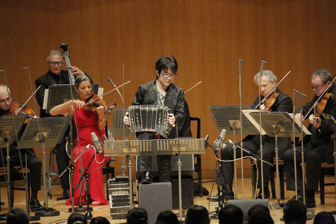 小松亮太がステージに登場し、いよいよイ・ムジチと小松亮太との夢のコラボレーションが始まる。小松が自らカウントを出し、奏で始めたのは20世紀初頭のタンゴの名曲、ガルデル「首の差で」。ピアノが特徴的なタンゴのリズムを刻み、ヴァイオリンやヴィオラが躍動的な旋律を奏でるその上で、メジャーとマイナーを行き来するような優美な旋律をバンドネオンが紡ぎだす。続く小松亮太のオリジナル「夢幻鉄道」も実に美しいメロディを持ち、どこか日本の歌謡曲にもなじむような、しみじみと郷愁を誘う曲だ。この日小松の演奏を初めて聴く観客も、ダイナミックに伸び縮みするバンドネオンの姿と共に、物悲しくも美しいその音色が胸に刻まれたに違いない。