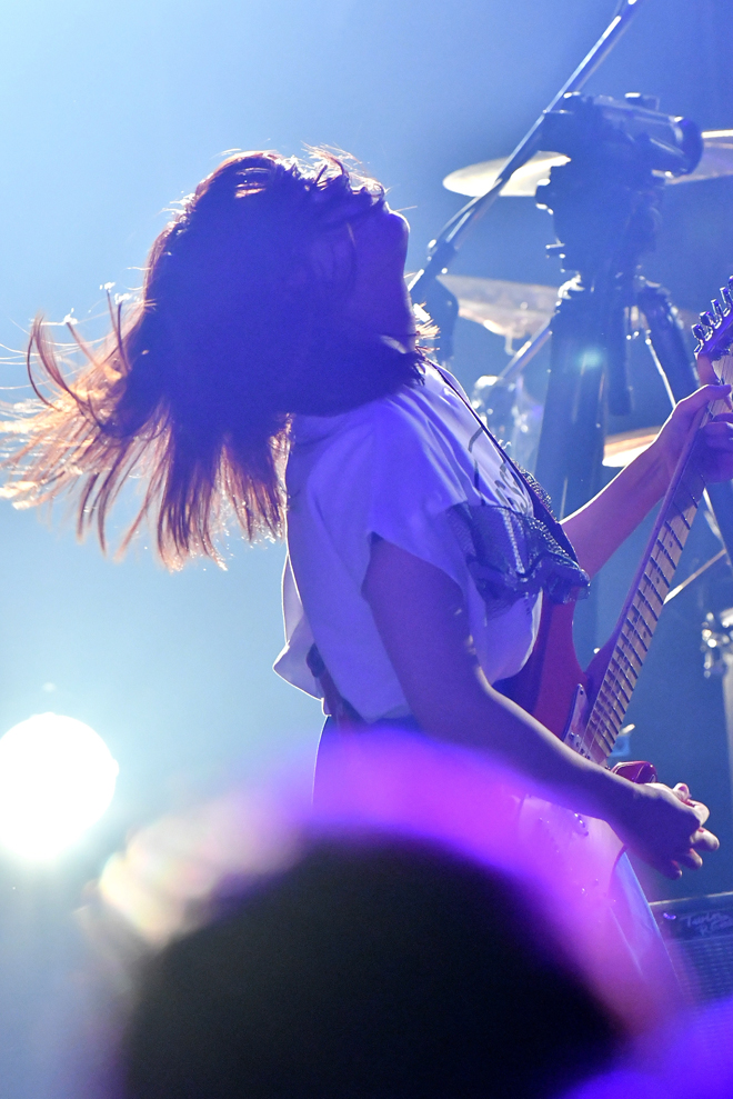 青いスカートにTシャツ、赤いギターを抱えたポチこと岩淵紗貴が、元気いっぱいに叫ぶと、それがはじまりの合図。WWWでMOSHIMOを観るのは、およそ3か月振り。Shiggy Jr.とのツーマン以来だが、ワンマンはやはり音も気迫も楽しさもちょっと違う。イッチーこと一瀬貴之のアクションも、そうくんこと宮原颯のクールで堅実なプレーも、きょーへーこと本多響平の“顔で叩くドラム”も、これまで以上にエモーショナル。5月にリリースしたミニアルバム『触らぬキミに祟りなし』からの「赤いリンゴ」は、イッチーがキーボードをピコピコ操り、ポチがハンドマイクでオーディエンスに呼びかける。「一緒にジャンプするよ!」 一斉に振り上げるたくさんの手に隠れて、ステージが見えない。