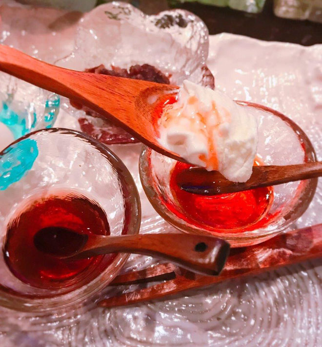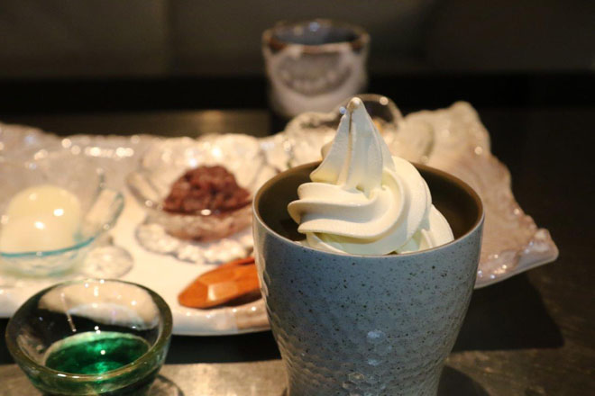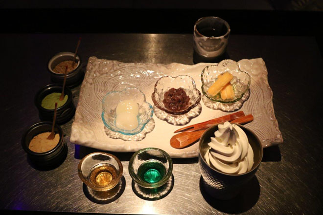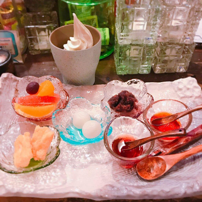 約70種類ほど用意されているリキュールは1人2種類まで選ぶことが可能で、2人で来ると4種類、3人で来ると6種類のリキュールをシェア出来る。ノンアルコールのものも16種類ほど用意されているので、デートはもちろん、スイーツ女子会や小さなお子様連れのファミリーまで楽しめるものになっている。また、トッピングとしてきな粉、抹茶パウダー、白ごまが使いたい放題。他にも白玉やあんこ、餅揚げ煎餅などの和菓子付き「竹」コース、さらにリキュール3種類とフルーツ小鉢が添えられた「梅」コースなども用意されている。尚、「ANA BAR CAFE」は座席数の都合上、現在は予約制となっている。