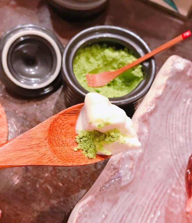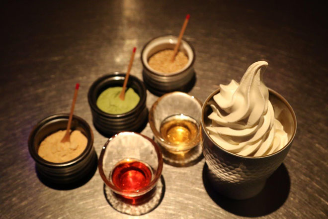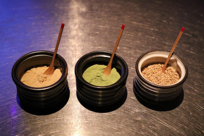 ▲トッピングのきな粉、抹茶パウダー、白ごま