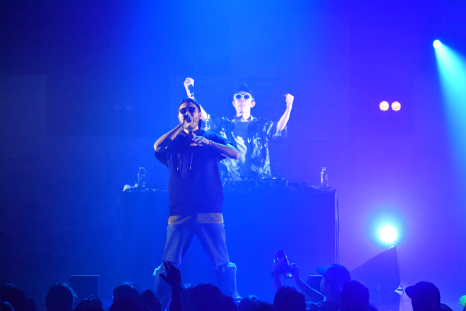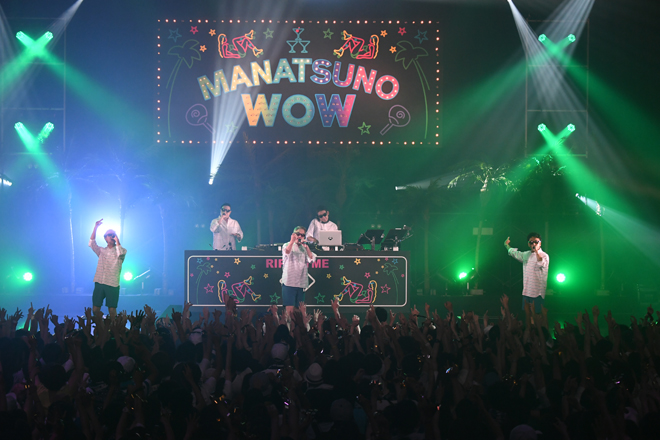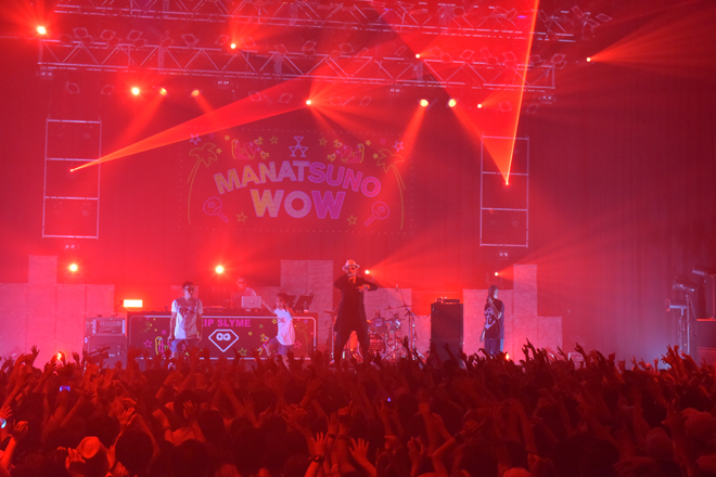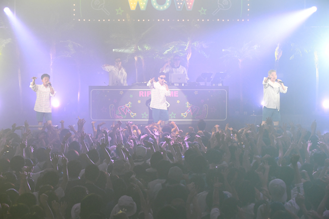 初日の開演時刻きっかりに場内が暗転し、大きな歓声が上がる中、ステージに現れたのはDJ FUMIYA。続けてWISEが登場し、DJブースの中のFUMIYAの横に立ち「Clap your hands!」「Put your hands up!」とフロアを煽っていく。そしてWISEの紹介でRIP SLYMEのMC陣が登場。1曲目「Super Shooter」のイントロで金テープも発射され、真夏の宴は盛大に始まった。その後はWISEがサポートメンバーとして加わったスペシャル編成のRIP SLYMEでパフォーマンス。グングン高まる会場の熱気にRYO-Zは「勝手に言うけど、ここはもう梅雨明けしました!」「真夏のWOWの開催を宣言します!」とアナウンスし、最後は同フェスのテーマソング「真夏のWOW」で会場を十分に温め、ホスト役をばっちり果たして初日の「真夏のWOW」がスタートした。