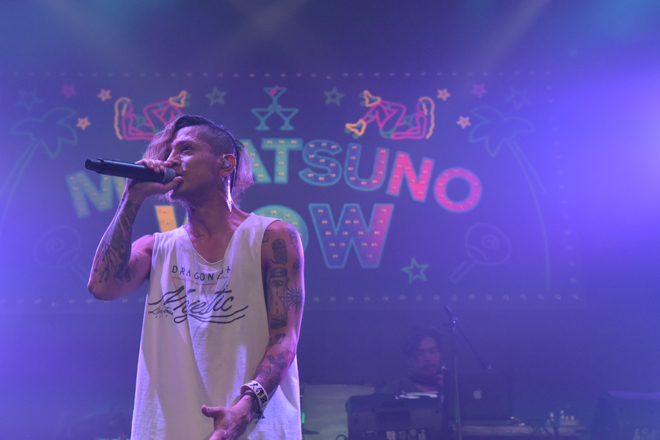 続いては、RIP SLYMEからPESが登場。第一回「真夏のWOW」以来、5年ぶりのソロステージとなった。前回はバンドを引き連れたが、今回はDJ NONとヨースケ@HOMEをサポートメンバーに従え、スモールコンボならではのカジュアルでリラックスしたライブを展開。途中にヨースケの曲を1曲含んだ、わずか30分の出番に観客から別れを惜しむ声が上がる中、最後はソロデビュー曲「女神のKISS」でフロアを盛り上げ、「このあとも楽しんでいってください!」とステージをあとにした。