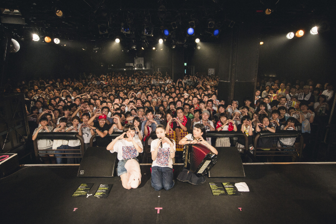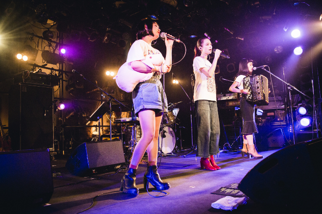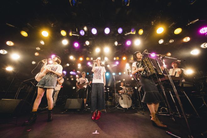 前半戦をつとめたのはチャラン・ポ・ランタン。冒頭から片平里菜の「煙たい」をカバーし、哀愁とキュートさを感じさせる歌声で片平へのリスペクトを見せた。2曲目の「進め、たまに逃げても」からはワンマンライブかと思わせるほどパワフルなステージングで会場のオーディエンスをぐいぐい惹きつけていく。「サイテーな女」ではもも(Vo)が前列の観客からタオルを拝借し、「誰のタオル? かっちゃんのかー!」というリアクションからお馴染みの超強引な小芝居で観客の笑いを巻き起こしていた。