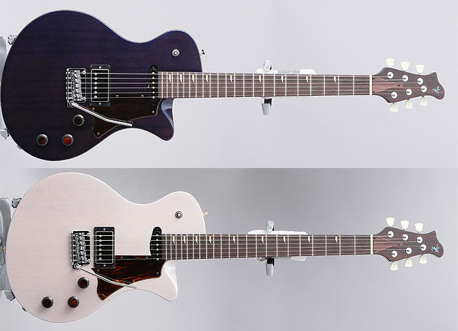 「BUMBLE(バンブル)」は、フロントピックアップに異なるタイプを搭載した2モデル「F6V」(240,000円 税別)と「F4V」(230,000円 税別)を各1色。いずれもボディに超軽量とされるアユース材を、センターにはメイプル材を使用。ブリッジは強度の高いメイプル材にしっかりと固定され、ブラス切削による専用の弦留めブロックをボディ裏に埋め込んだ。これにより比較的軽量ながら豊かなサスティーンと芯のあるサウンドが特徴となっている。ネックは強度も申し分ない3ピース構成のハードメープル材で、レスポンスにも優れる。「F6V」はP90タイプフロントピックアップでの甘いリードからリアピックアップでは切れのあるコードカッティングまで幅広く活躍。「F4V」は2シングルのピックアップ構成としコードカッティングを多用するギタリストに特におすすめの1本。