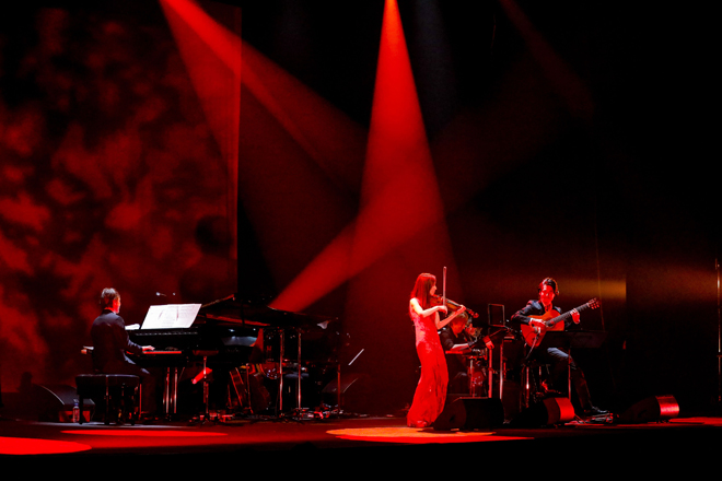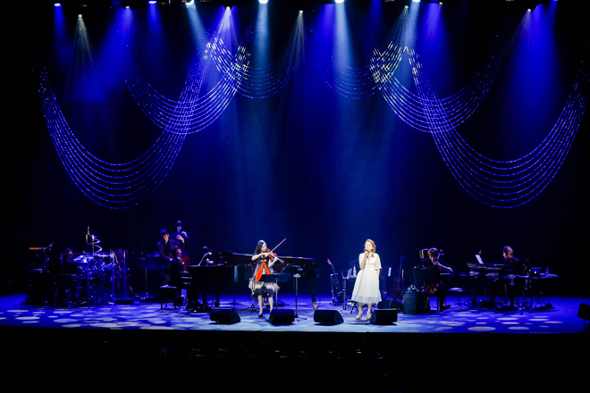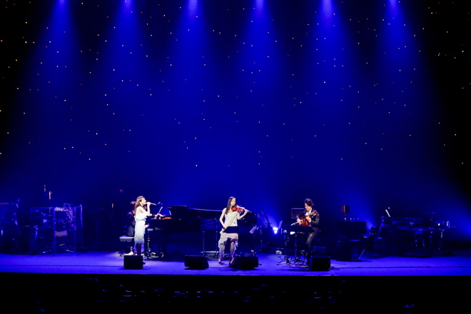 そしてアルバム『amour』に収録された2曲「HA・RE」「flower」を続けて演奏。ピアノとチェロとヴァイオリンで静かに始まる「HA・RE」は、目の前に草原の風景が広がるかのような気持ちの良い空気を感じさせる。たおやかなメロディ、ウッドベースの響きがヴァイオリンと絡んで心地よい。「flower」では、ステージの背景が夕焼けの空と雲、そして花びらが散りばめられ、舞台が明るくなる。親しみやすいメロディと音色で、風景が次々と変わり、効果的なライティングとも相まって、普通のクラシックコンサートにはない華々しさに満ちており楽しい気分になってくる。