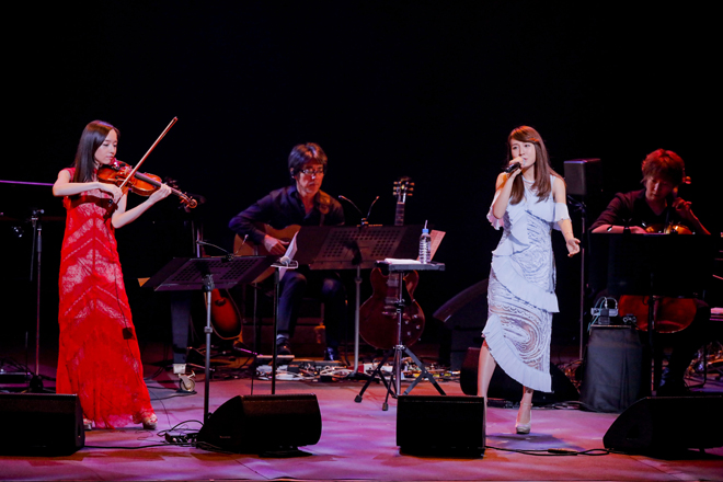 まず披露したのは、2015年リリースの作品『birth』から「風笛~Love Letter」。これは平原が歌詞を書いている楽曲だ。おだやかなメロディ、高音が透き通る平原の声にやさしく寄り添うヴァイオリン。大切なものを守りたいという心がリスナーにもストレートに伝わってくる素晴らしい演奏だ。