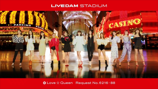 また「Love ☆ Queen」をLIVE DAM STADIUMに搭載されているデュアルモニター機能で歌うと、メインモニターには「Love ☆ Queen」のミュージックビデオを、スペシャルモニターにはCMのメイキング映像とミュージックビデオをミックスした特別映像を映しながらカラオケを楽しむことができる。